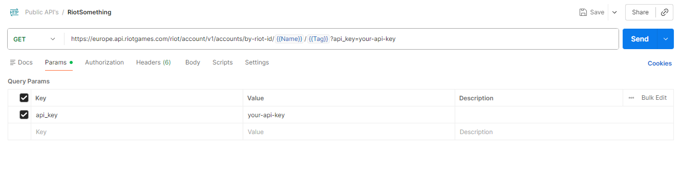 The query params that was created, you have the key/value-pair with the API-key and the value being the key from your riot games developer dashboard. Once you have this, click the 'Send'-button and you should get a response that looks kinda like this, in a JSON structure: