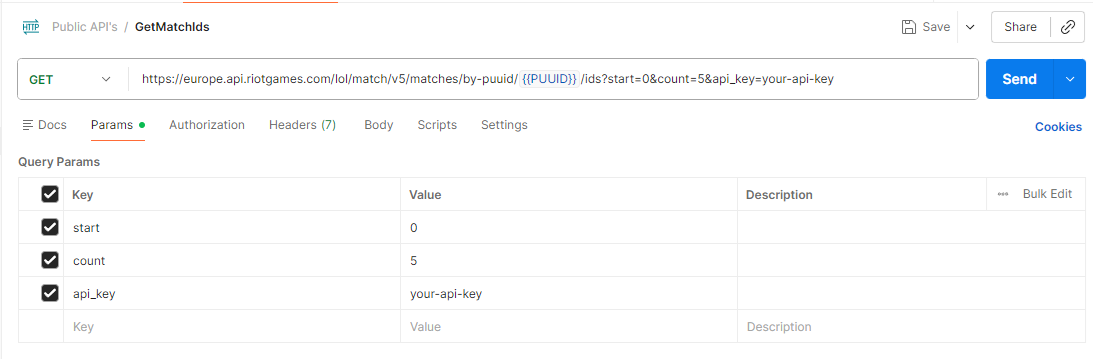 First of all, start by saving th PUUID you got from the previous response as we will need this for this next endpoint.